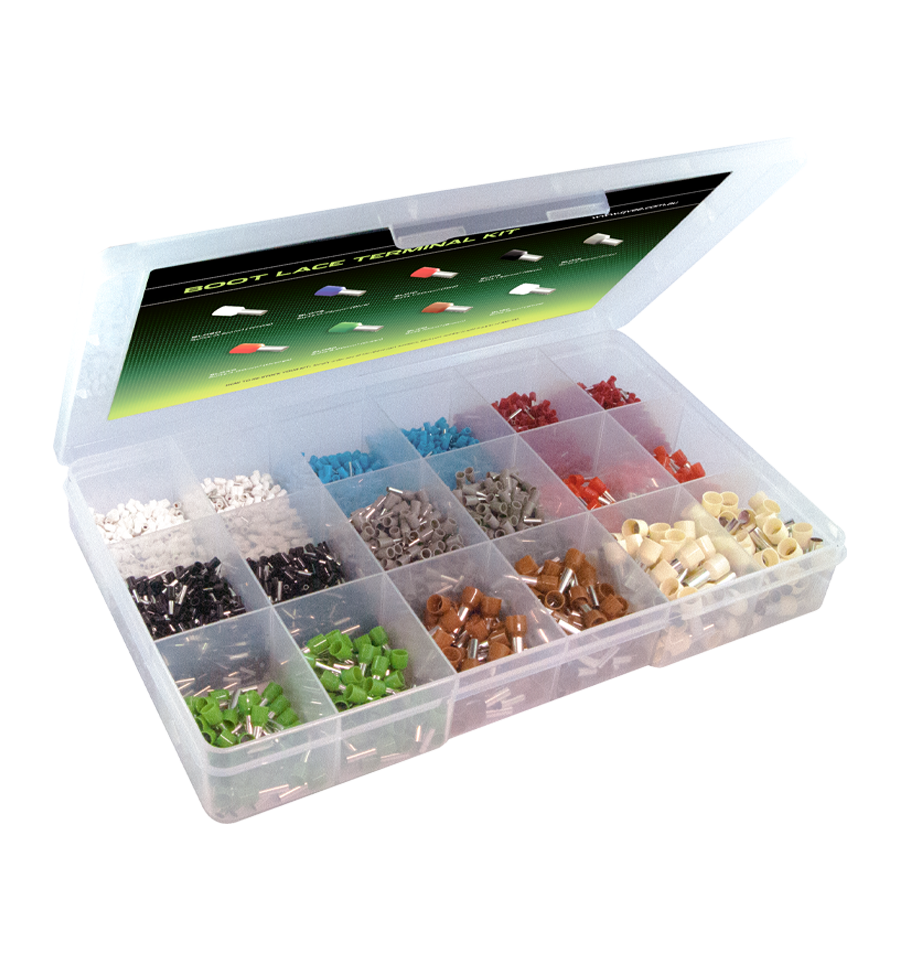 2,901 piece boot lace terminal assortment kit.